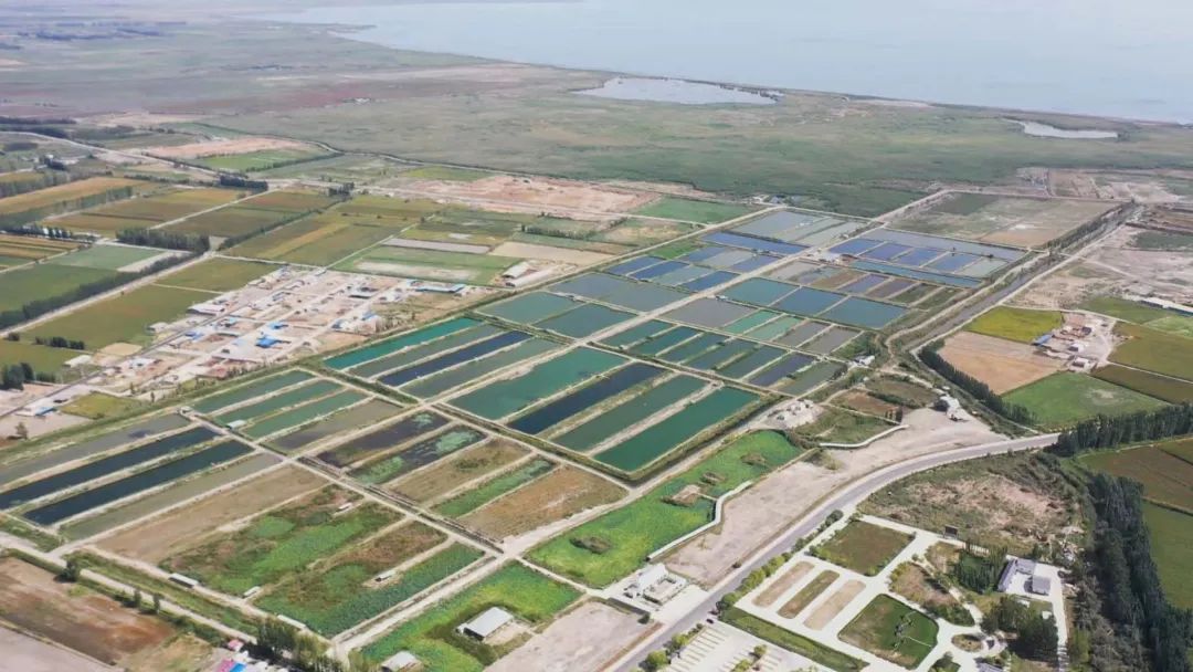 图为航拍博湖县乌兰再格森乡的水产养殖基地。董柱岑摄